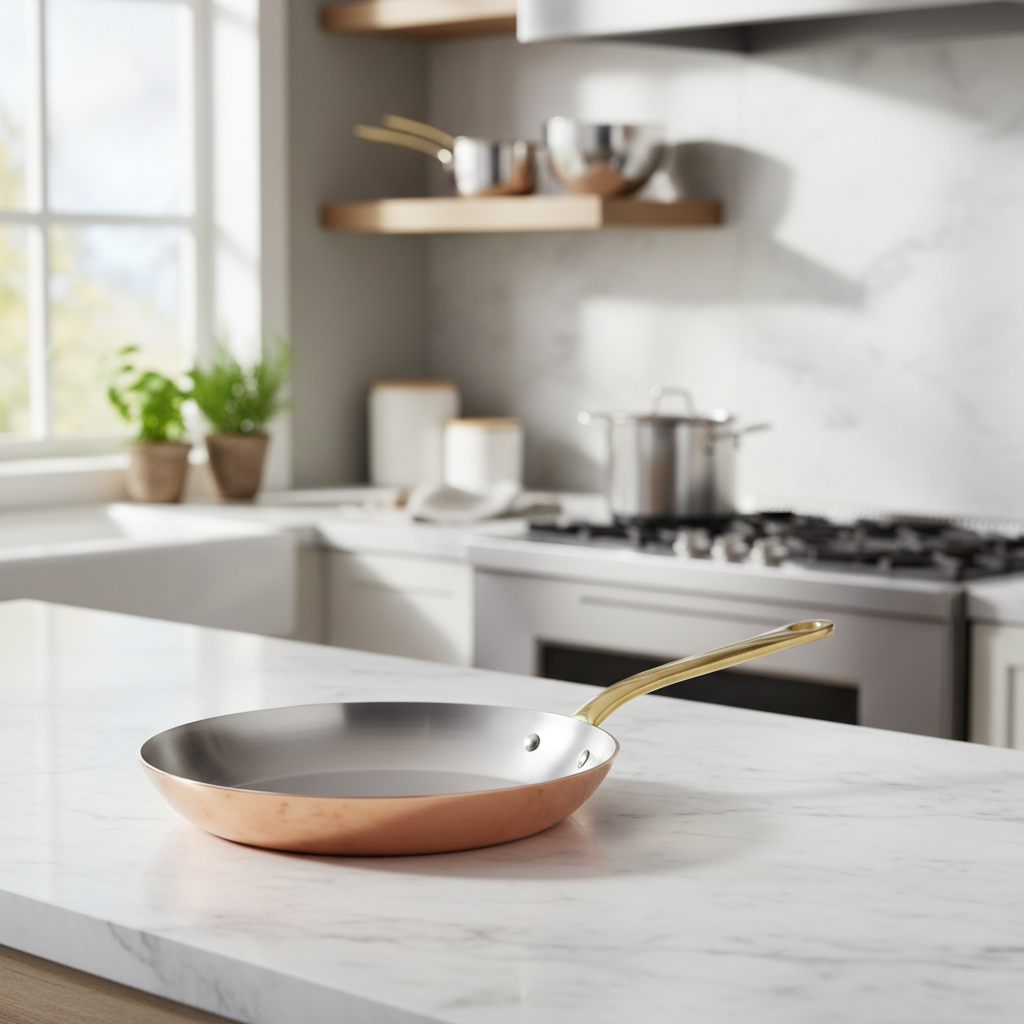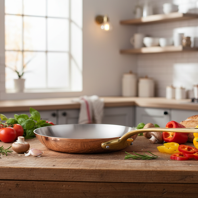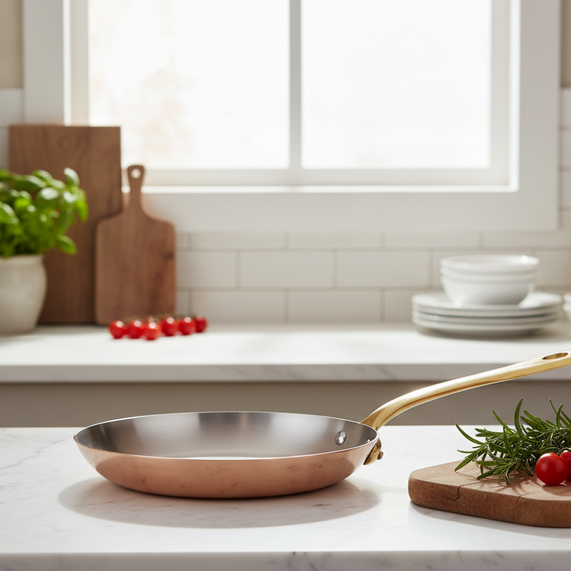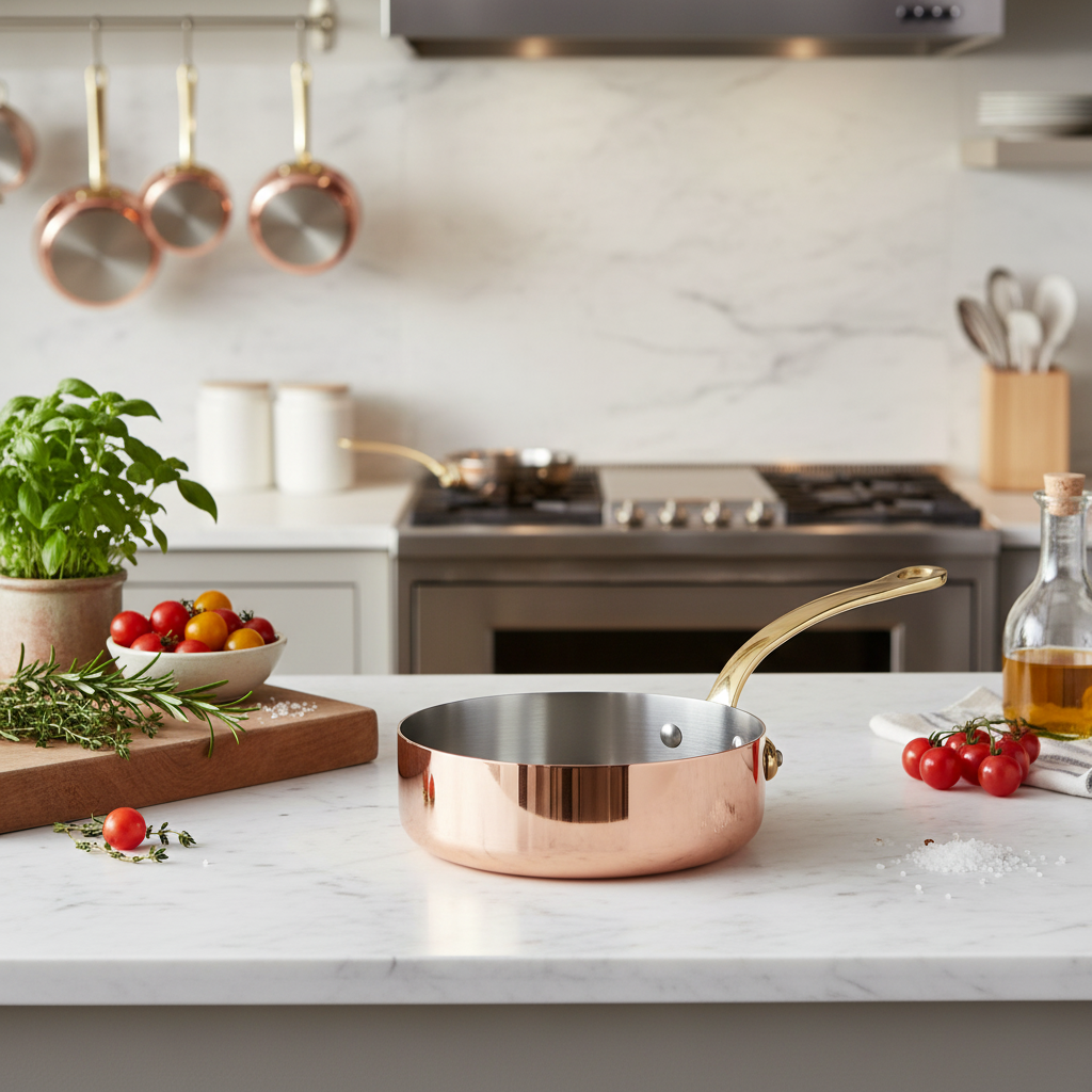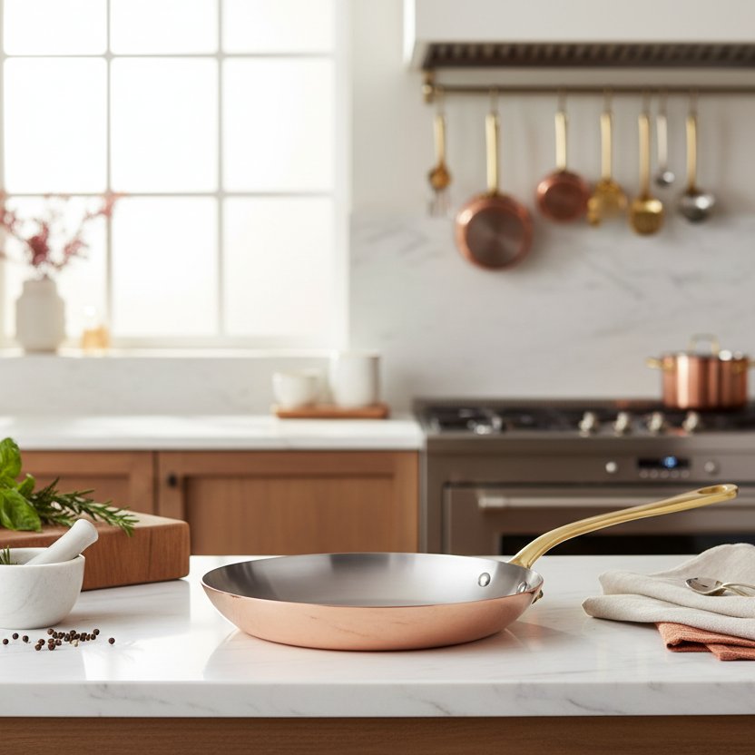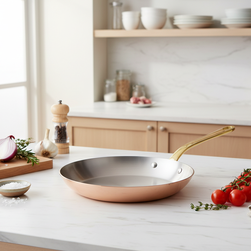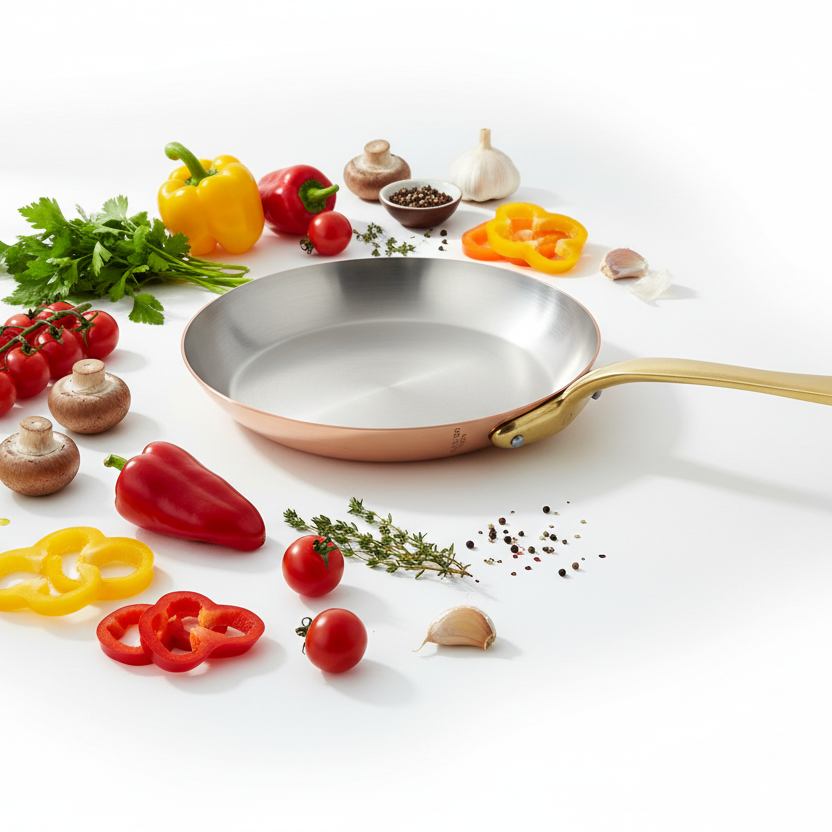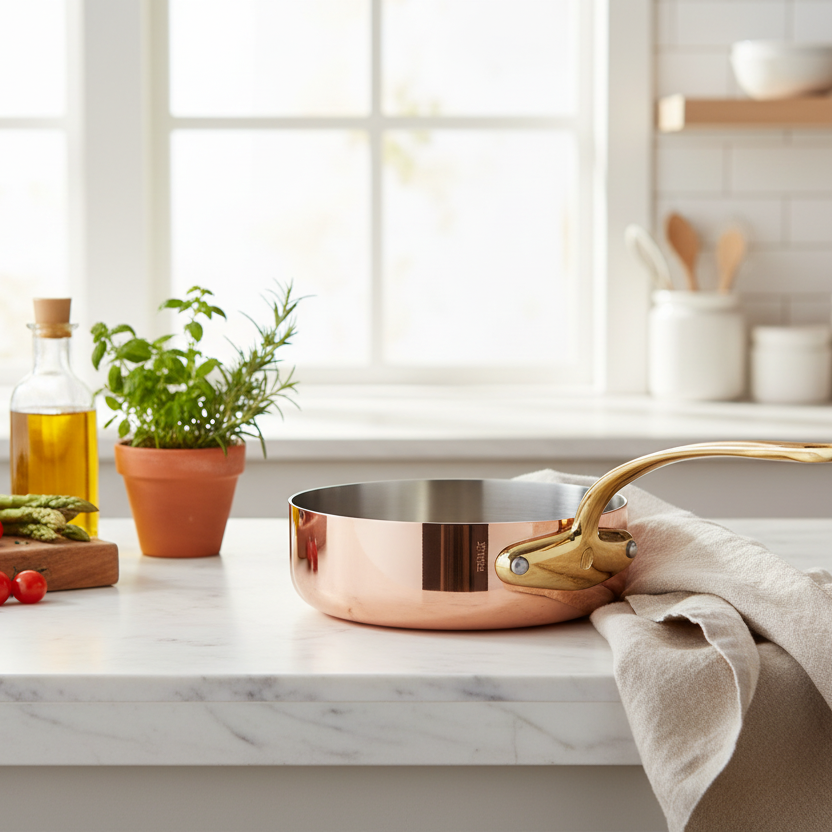 Polished copper associated to stainless steel, enhances the pleasure to cook. The collection is defined in two thicknesses, according to the user expertise: a thickness of 2 mm for a standard use from the range M’HERITAGE 200.