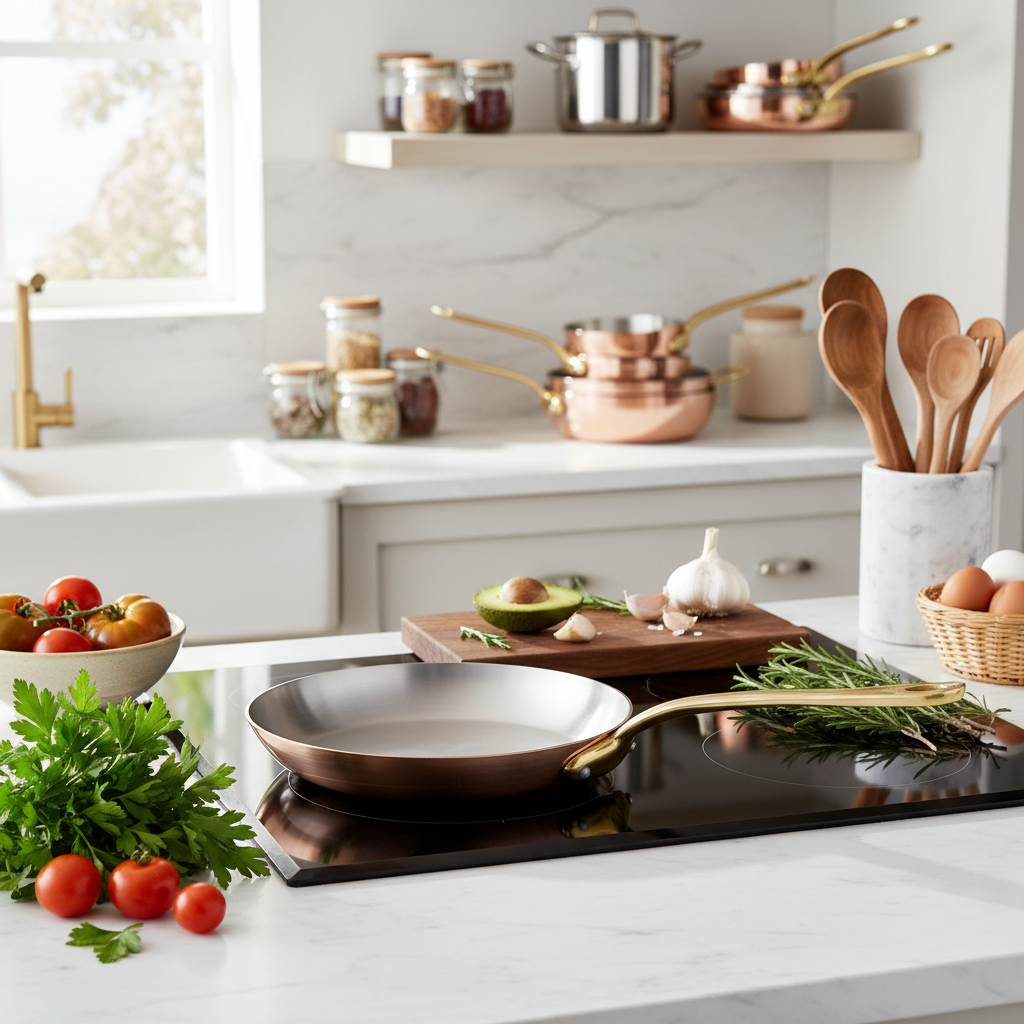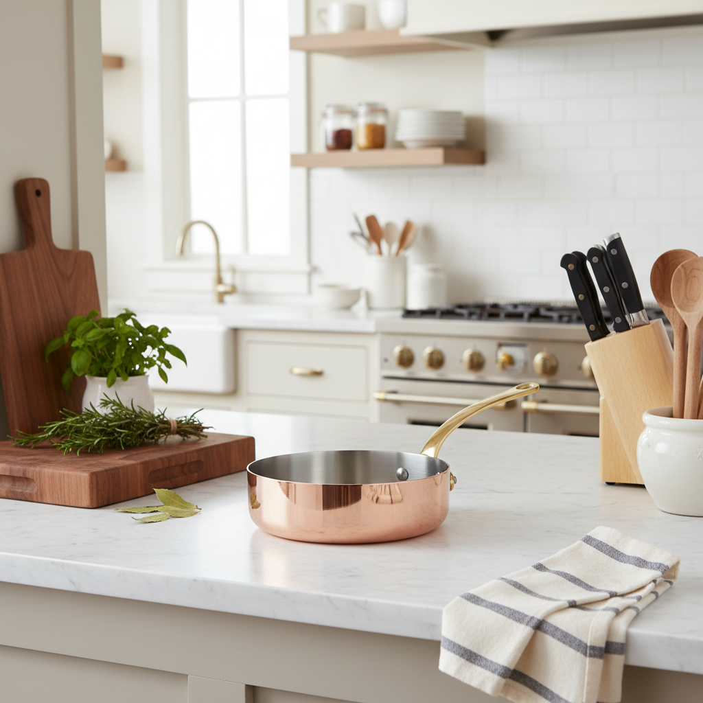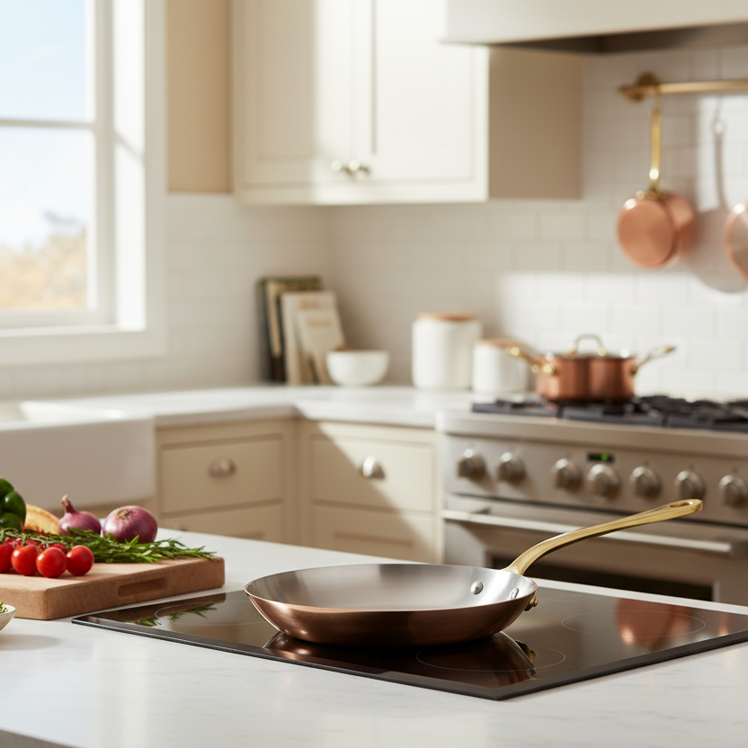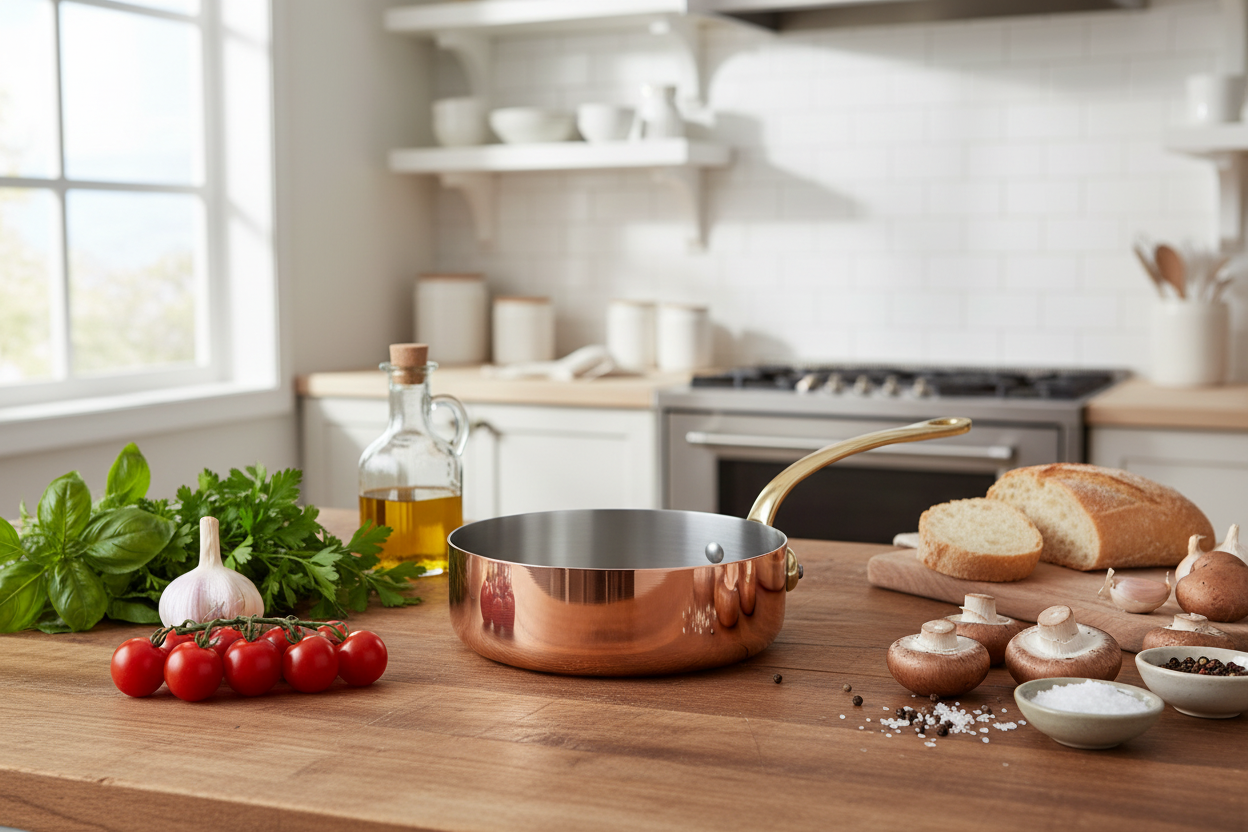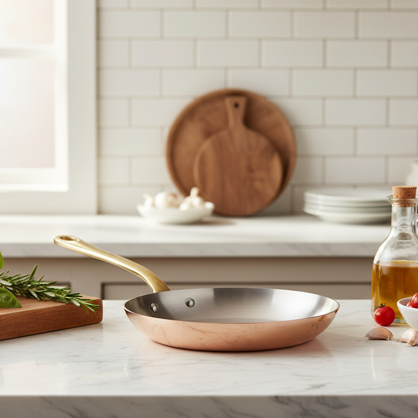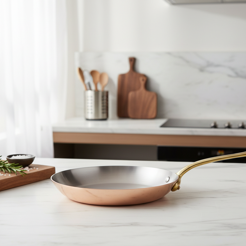 Polished copper associated to stainless steel, enhances the pleasure to cook. The collection is defined in two thicknesses, according to the user expertise: a thickness of 2 mm for a standard use from the range M’HERITAGE 200.
