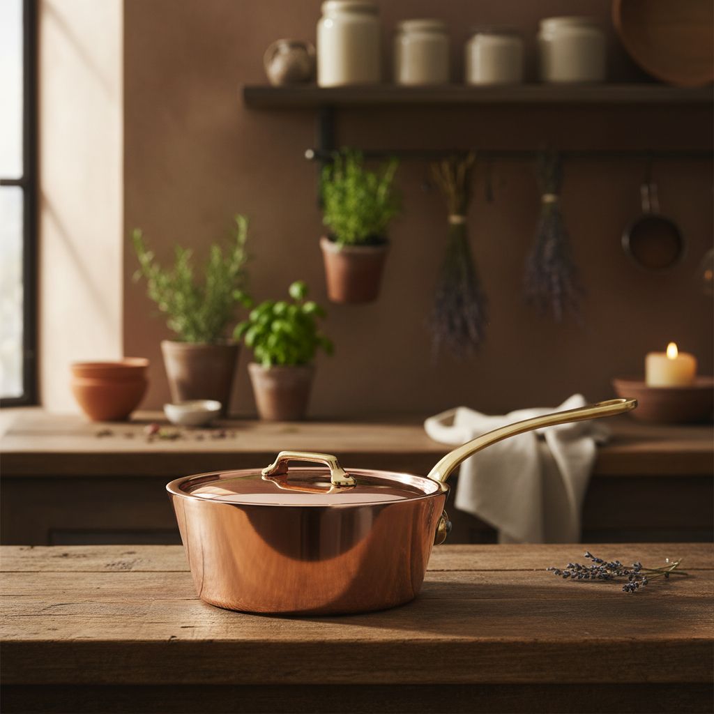 Polished copper associated to stainless steel, enhances the pleasure to cook. The collection is defined in two thicknesses, according to the user expertise: a thickness of 2.5 mm for a standard use from the range M’HERITAGE 200.