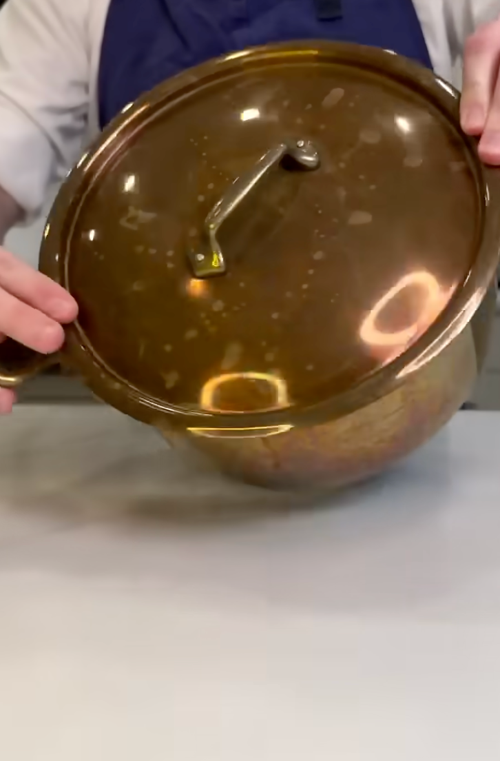 Cleaning the inside of unlined copper is essential. To remove any verdigris on an unlined pan, use a vinegar-salt solution or rub it with lemon sprinkled with salt. Rinse and dry the pan.
