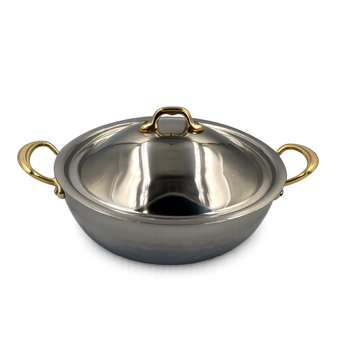 Mauviel M'ELITE B Hammered 5-Ply Curved Splayed Saute Pan With Lid, Brass Handles, 3.3-Qt